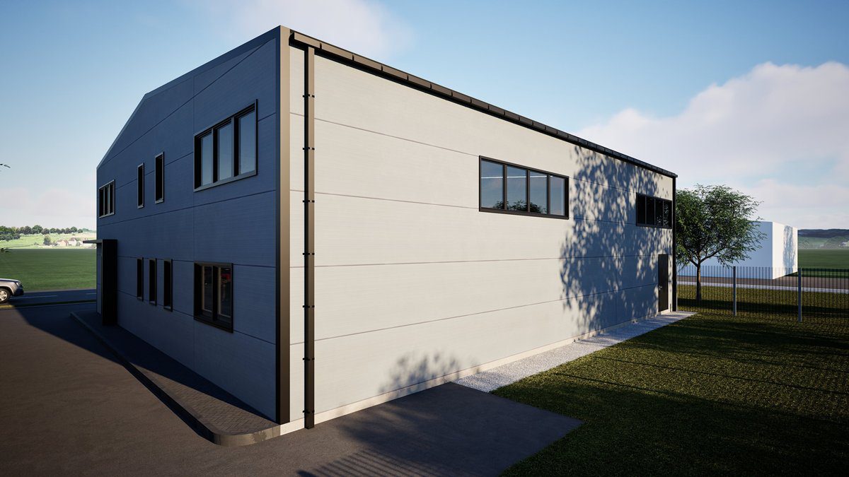 Designul halei pune accent pe funcționalitate, fără a neglija aspectul estetic. Fațadele sunt finisate cu panouri metalice de culoare aleasă din gama RAL, cu o cromatică modernă și rezistentă în timp. Volumetria este simplă, dar adaptabilă, iar structura permite compartimentări flexibile.